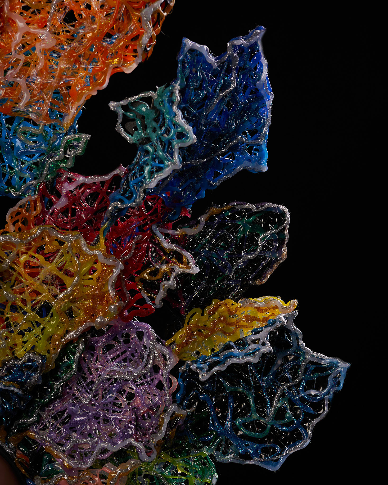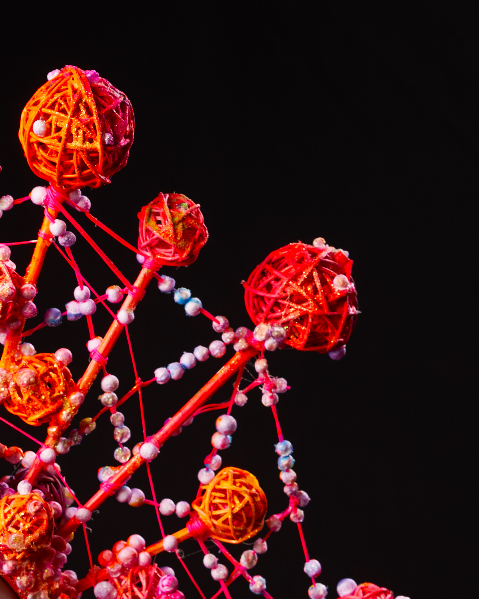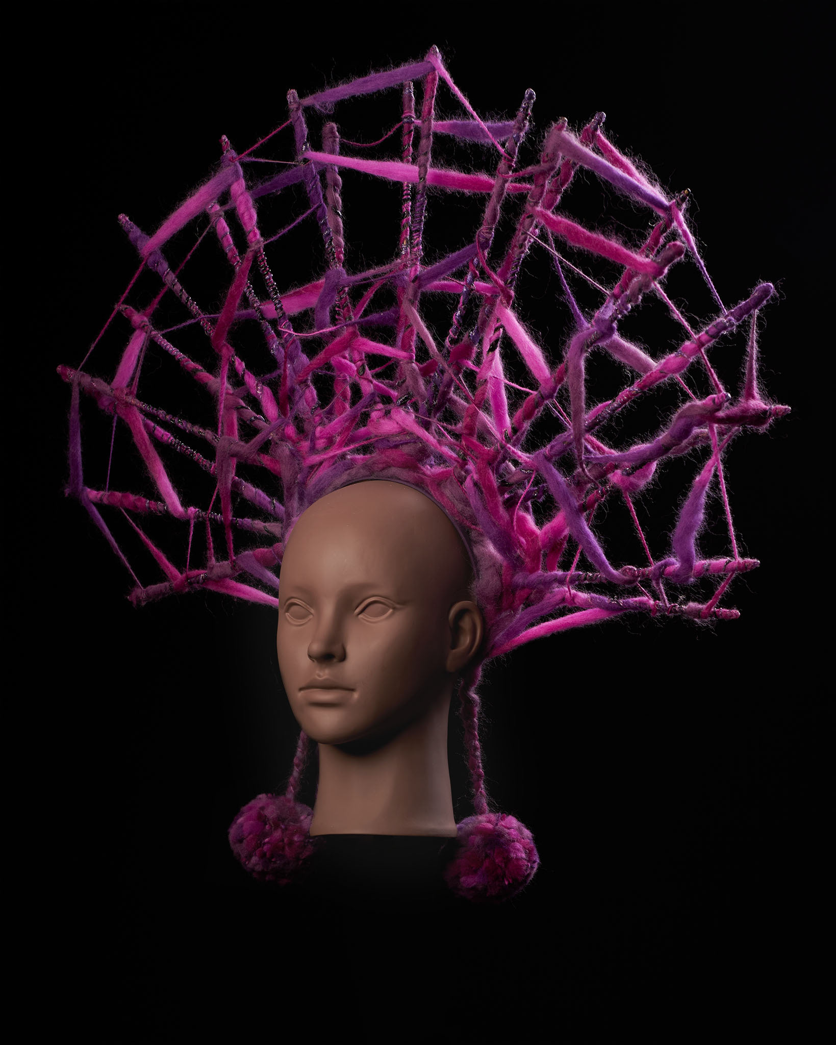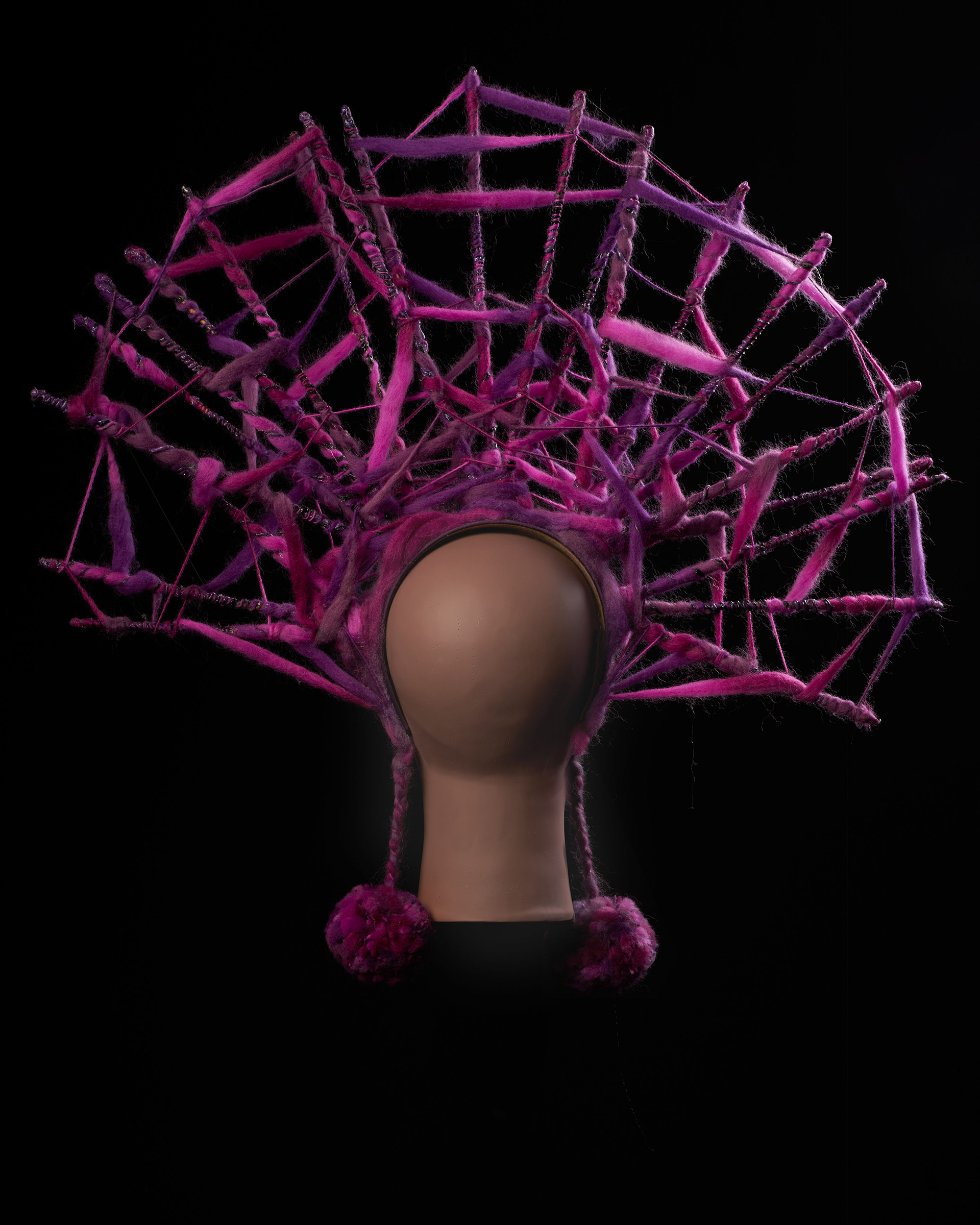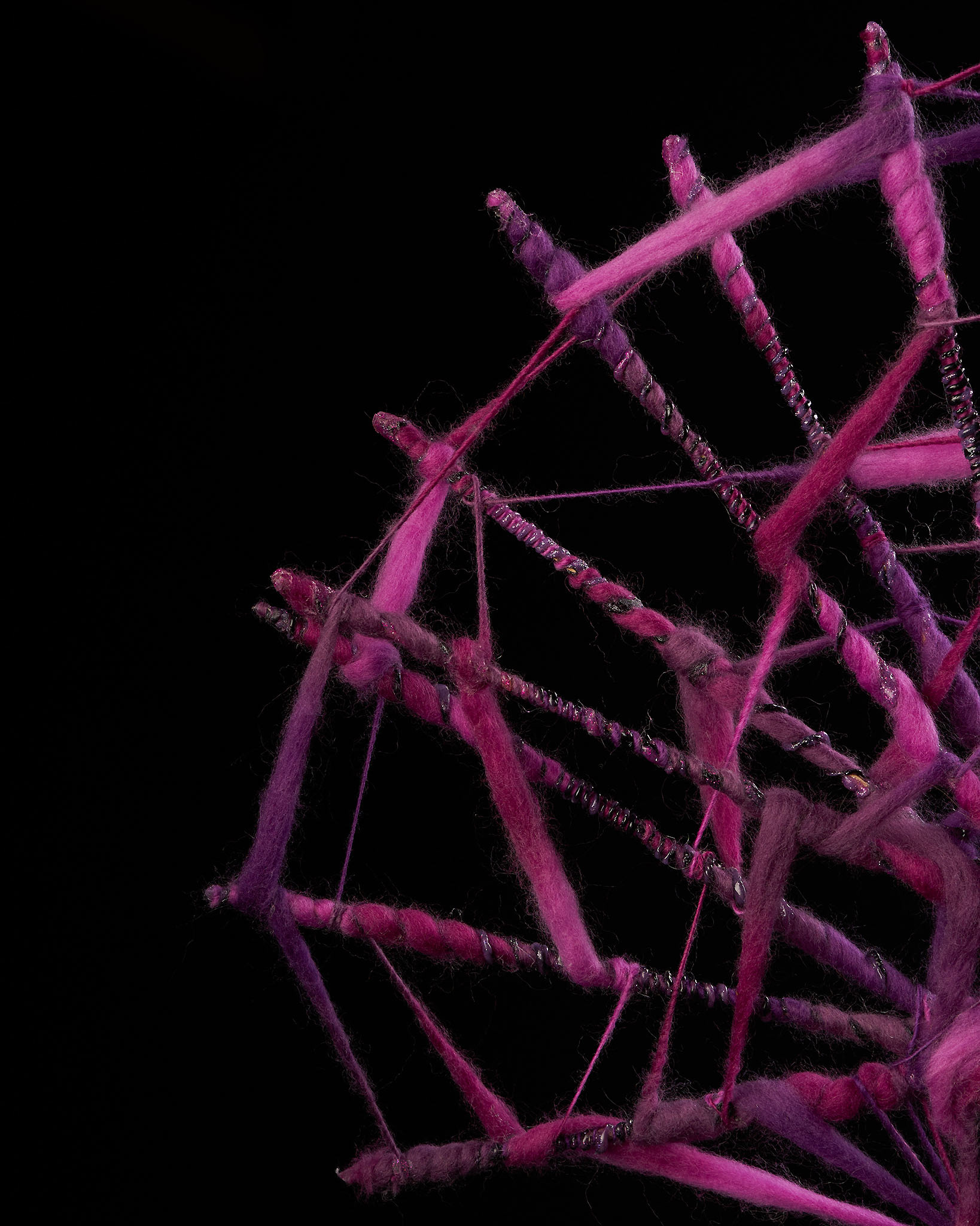She uses various and sometimes unexpected materials starting from yarn to random objects. Every piece is one of kind and is never repeated.